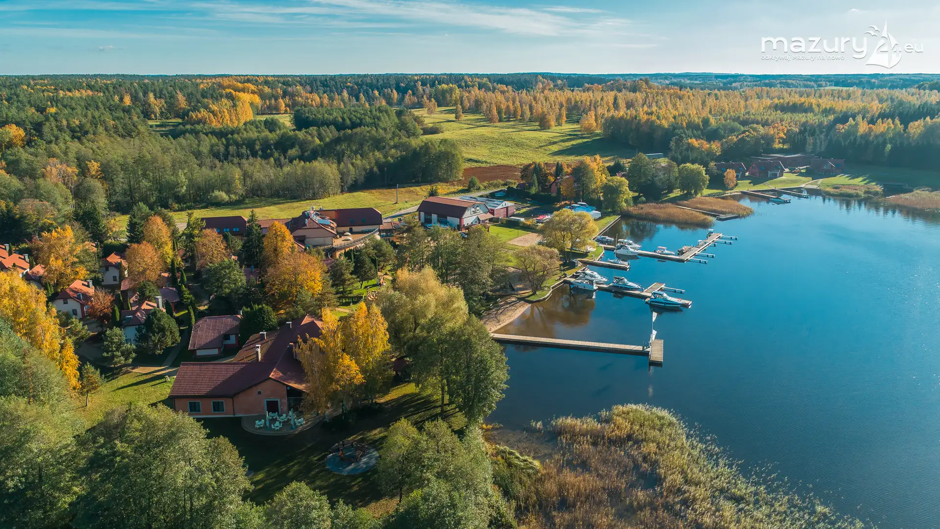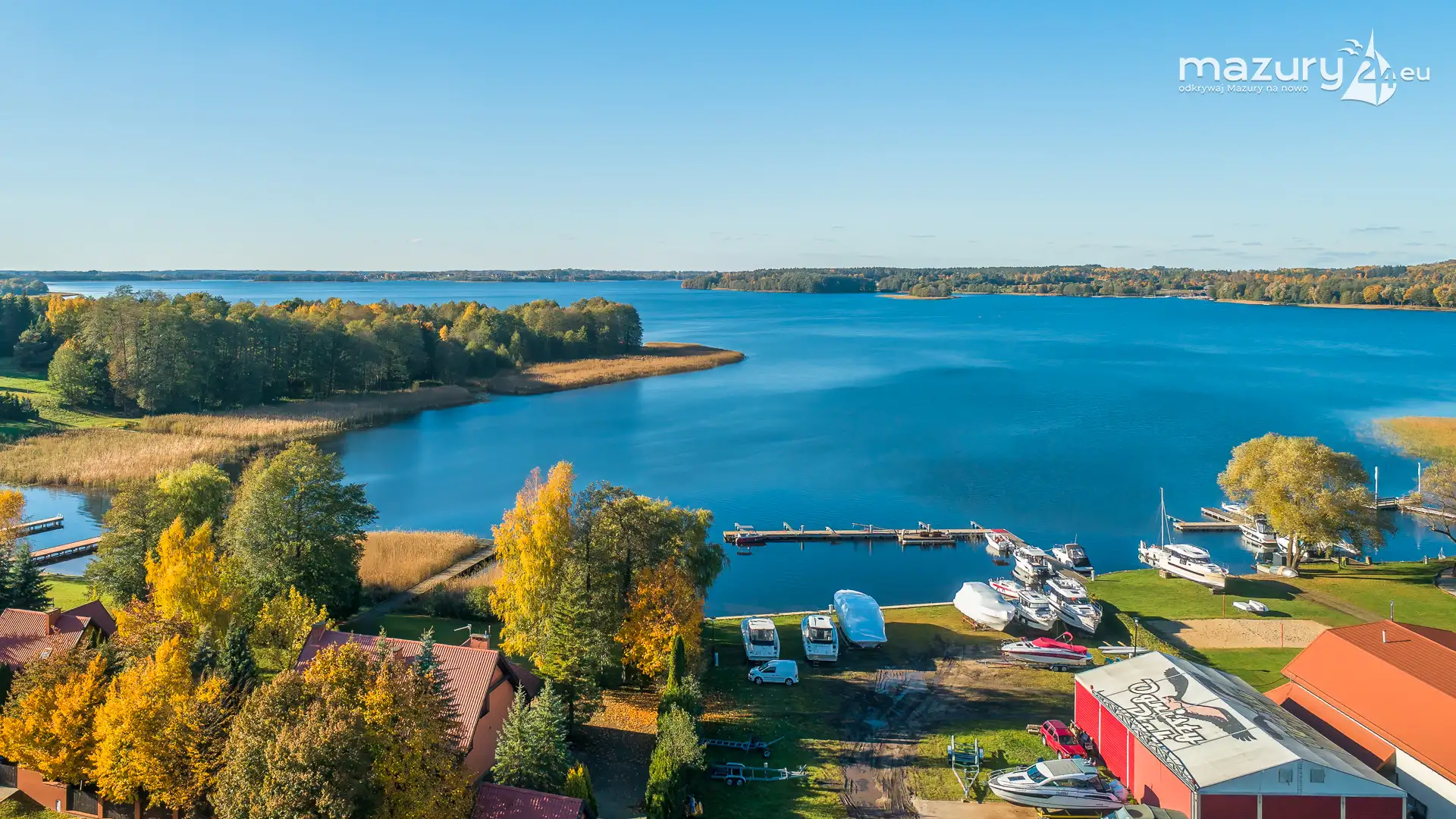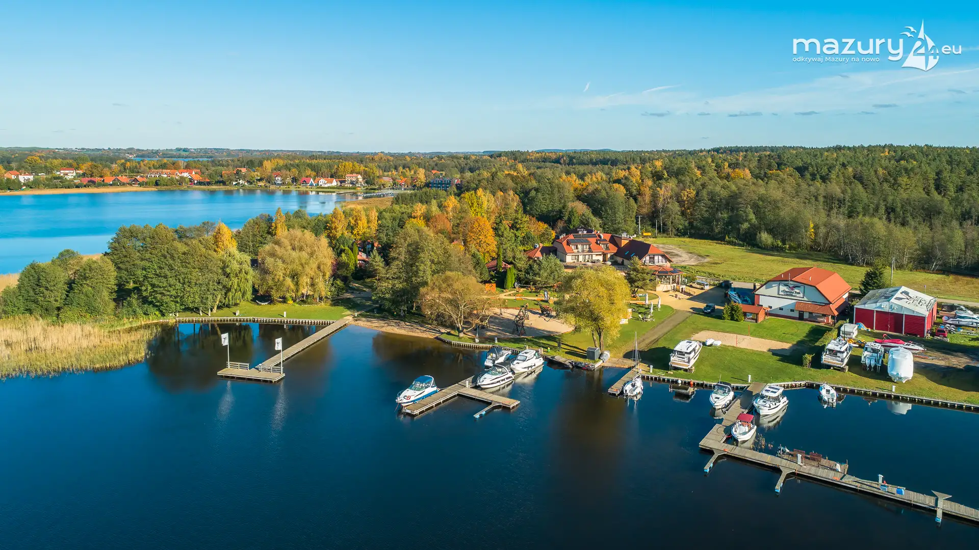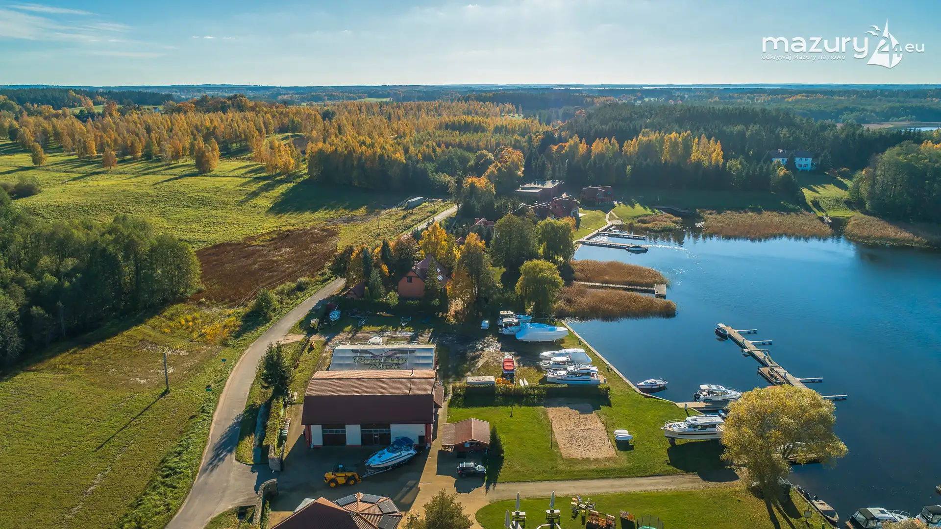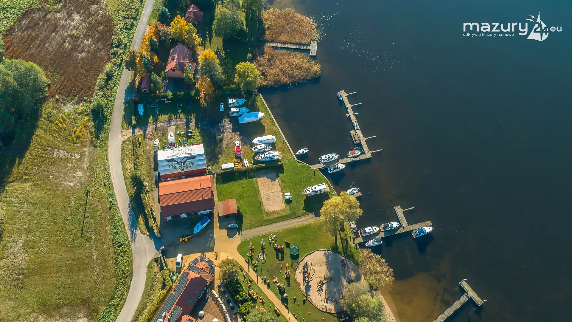 Kolejnym miejscem które złapaliśmy "z góry" podczas wybuchu jesiennych kolorów jest jezioro Święcajty i port Ognisty Ptak, leżący na północnej części szlaków WJM. Niby nic takiego, pokazywaliśmy Wam to miejsce wiele razy, w końcu udało nam się jednak złapać jesienną paletę barw. Piękne te Mazury jesienią...