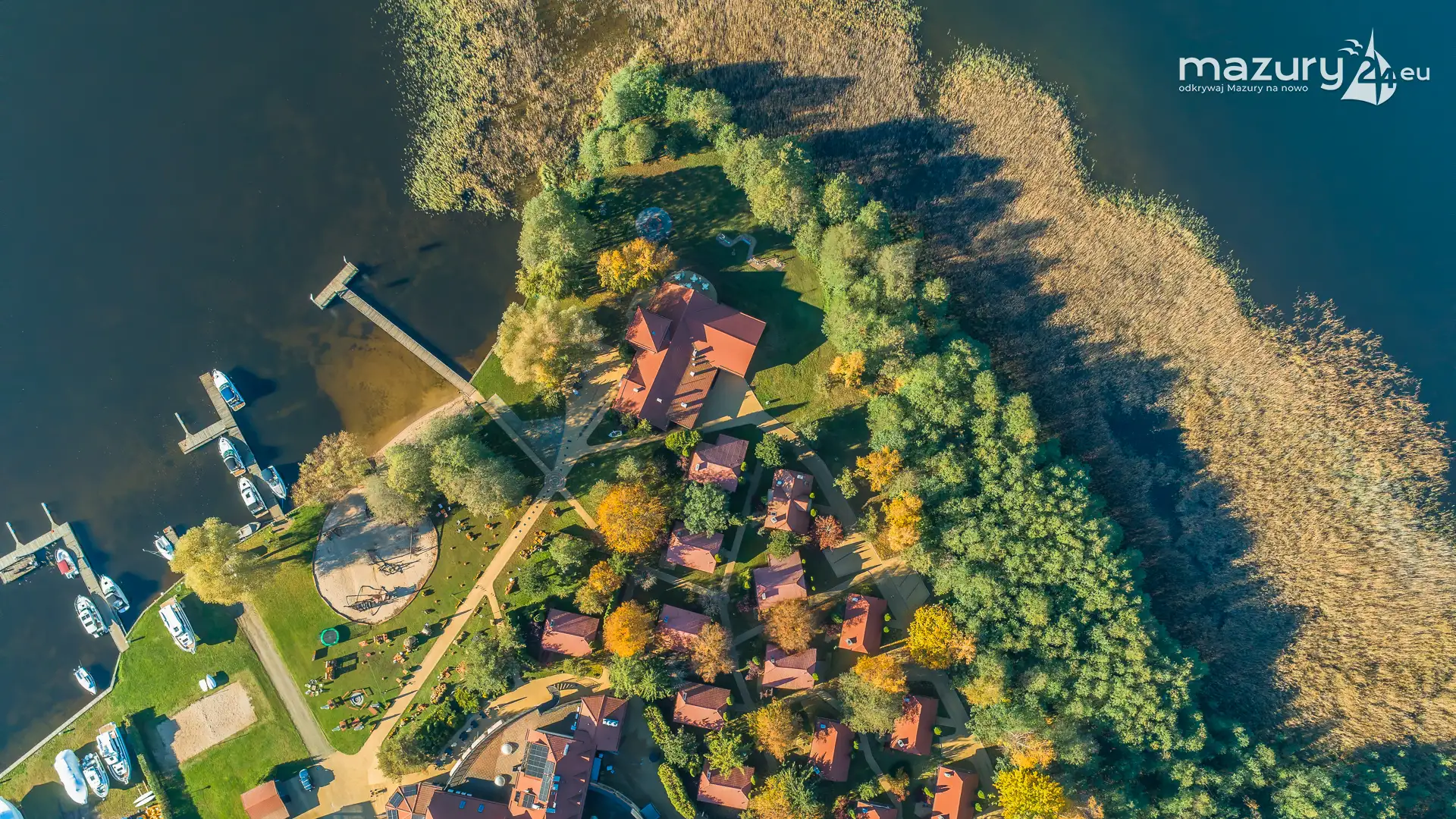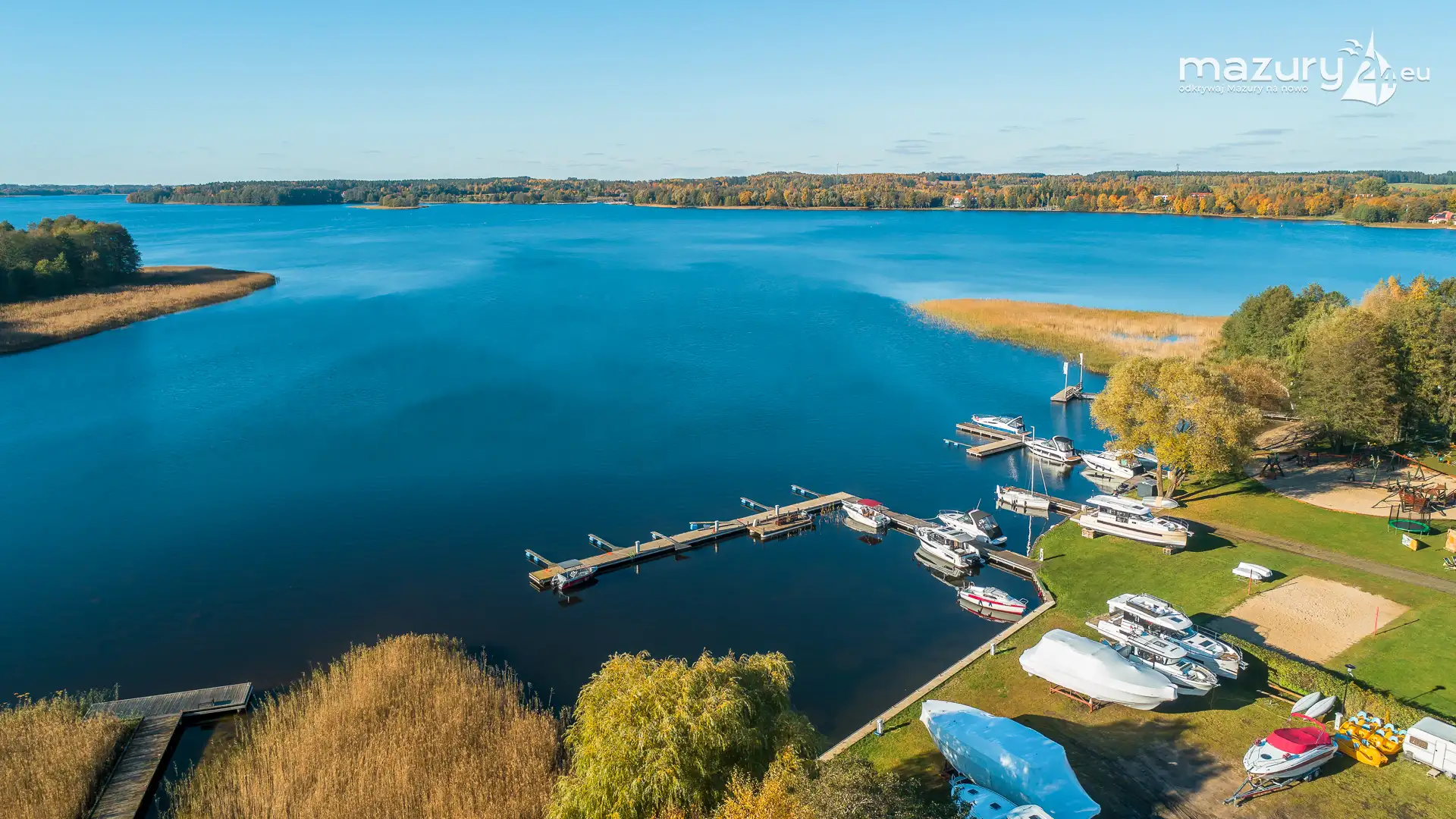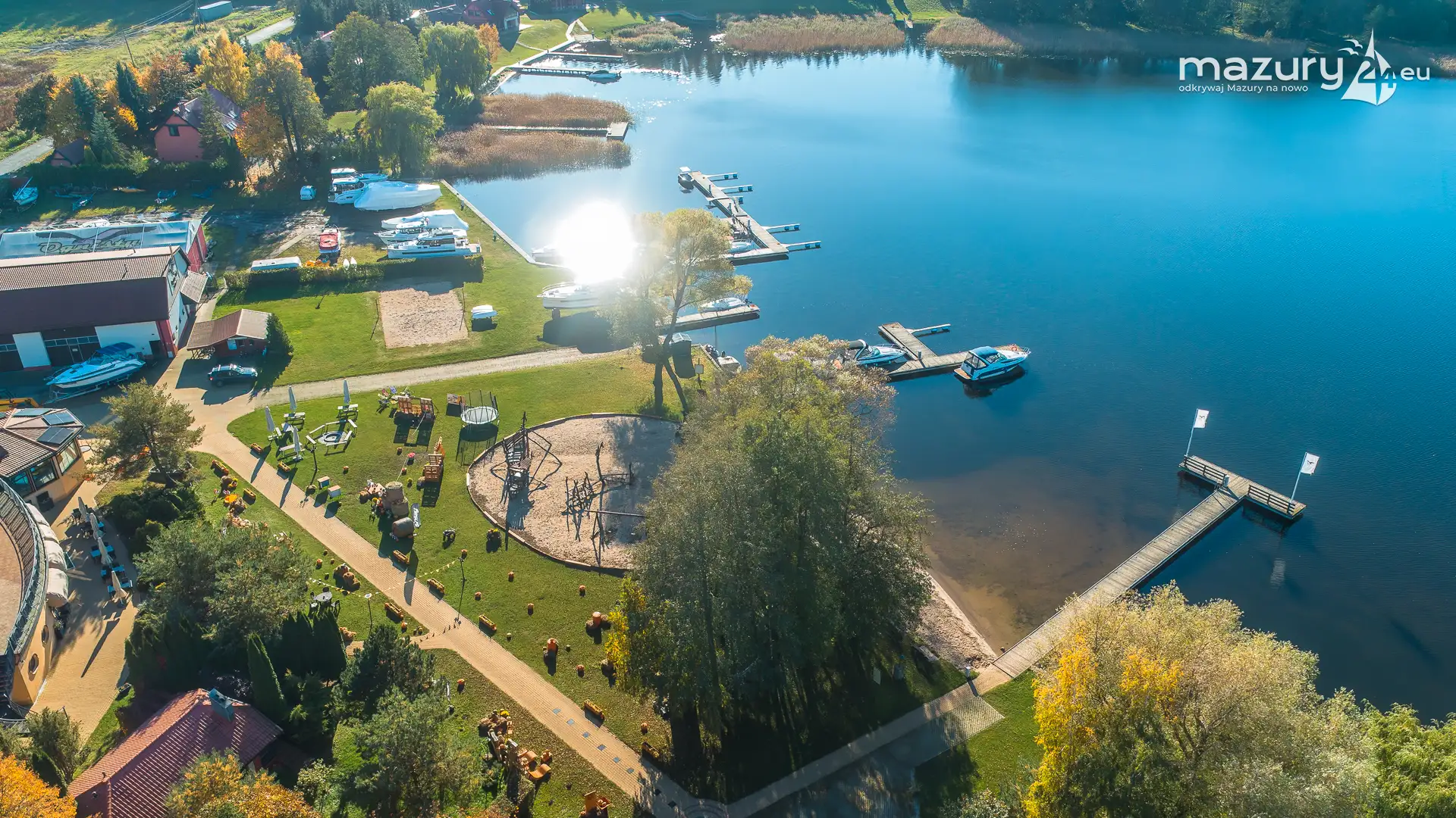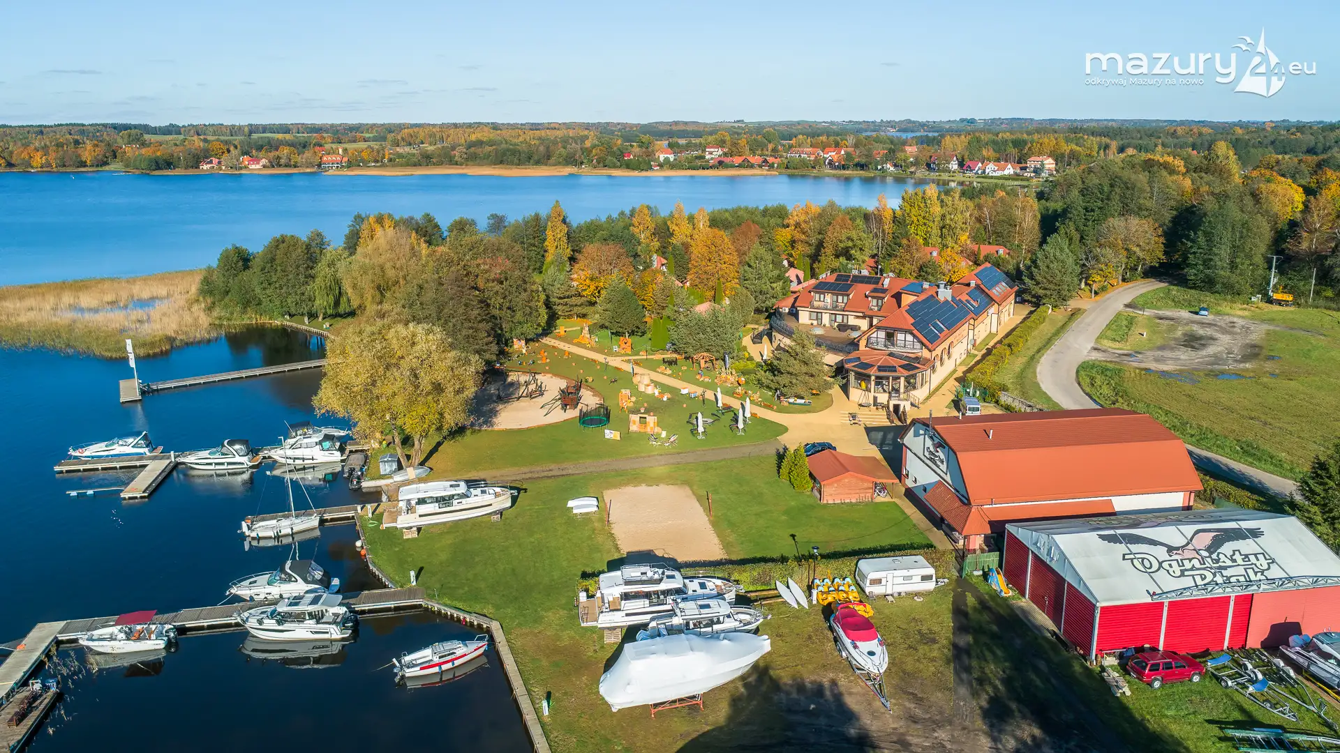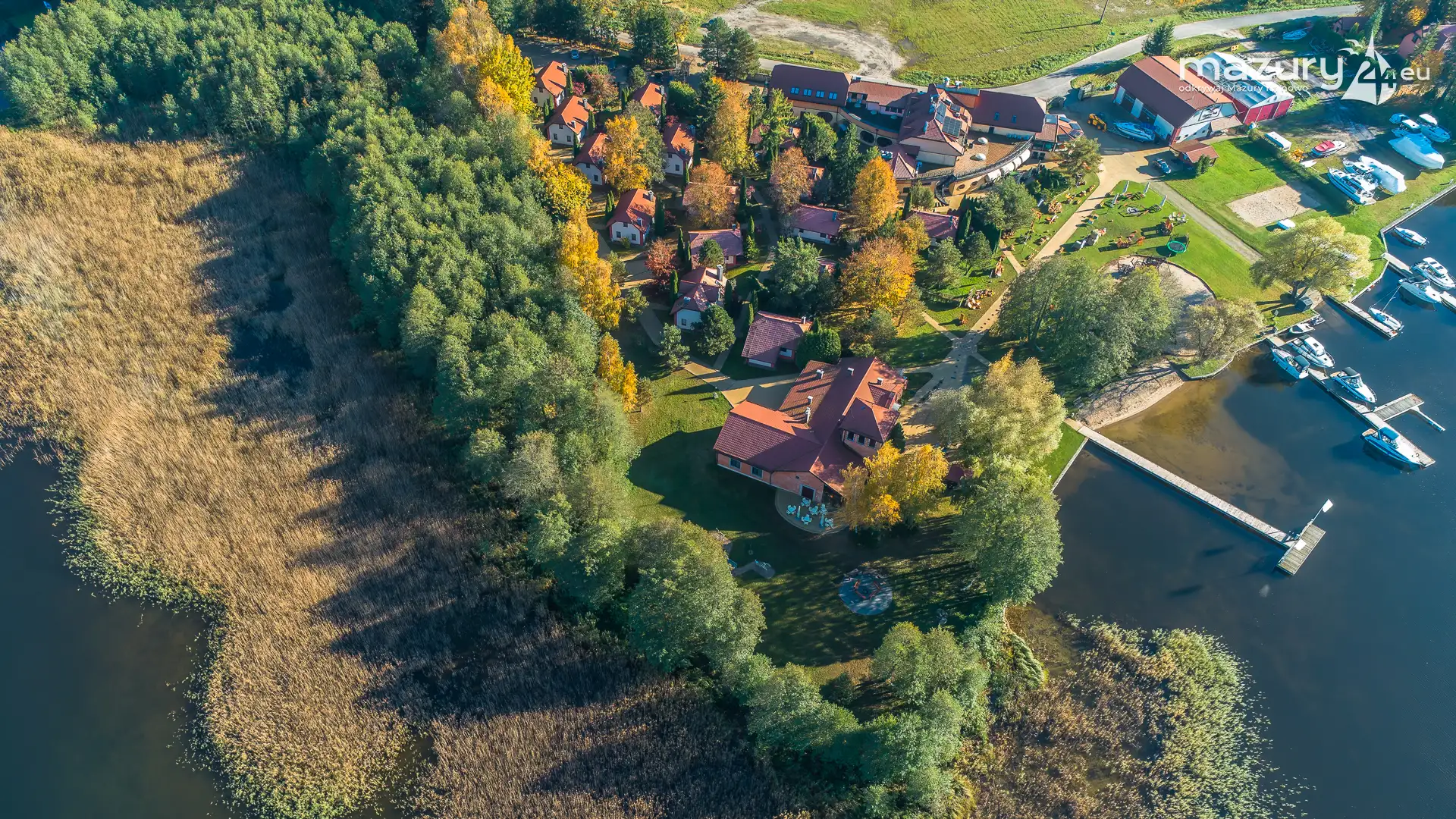 Kolejnym miejscem które złapaliśmy "z góry" podczas wybuchu jesiennych kolorów jest jezioro Święcajty i port Ognisty Ptak, leżący na północnej części szlaków WJM. Niby nic takiego, pokazywaliśmy Wam to miejsce wiele razy, w końcu udało nam się jednak złapać jesienną paletę barw. Piękne te Mazury jesienią...